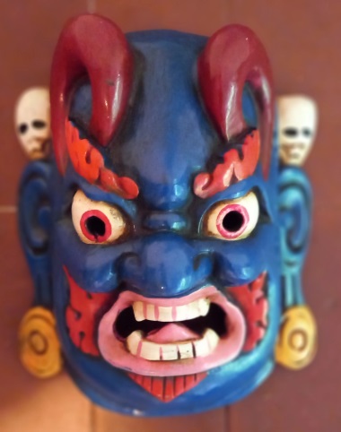 Wooden mask, handmade of Tibetan origin. Among other things, these masks represent divinities, benign or evil spirits.
